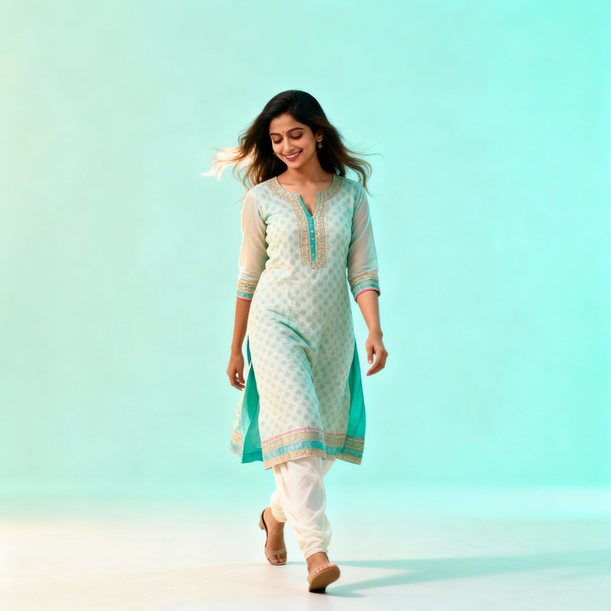 Prompt: An Indian woman wearing a stylish modern Indian dress, captured walking while looking slightly downward with a soft smile. One foot mid-step, body relaxed and natural. Hair softly framing the face with light motion. Expression warm, confident, and approachable. Makeup fresh and camera-ready. Lighting bright and clean, enhancing clarity. Background minimal or pastel-toned for social media reels. High realism, cinematic framing, modern influencer aesthetic.